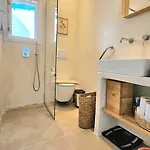 Die Badezimmer in der Villa Tinos Seaside Gem - Cycladic 2Br 500M From Center sind mit einer begehbaren Dusche und einer getrennten Toilette ausgestattet. Außerdem können Gäste den Komfort von einem Haartrockner, Morgenmänteln und Badelaken genießen.